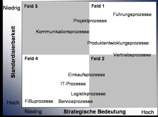Für die Bestimmung von Outsourcingpotenzialen der Geschäftsprozesse können wir die Abbildung der einzelnen Prozesse in einem Prozessportfolio empfehlen.